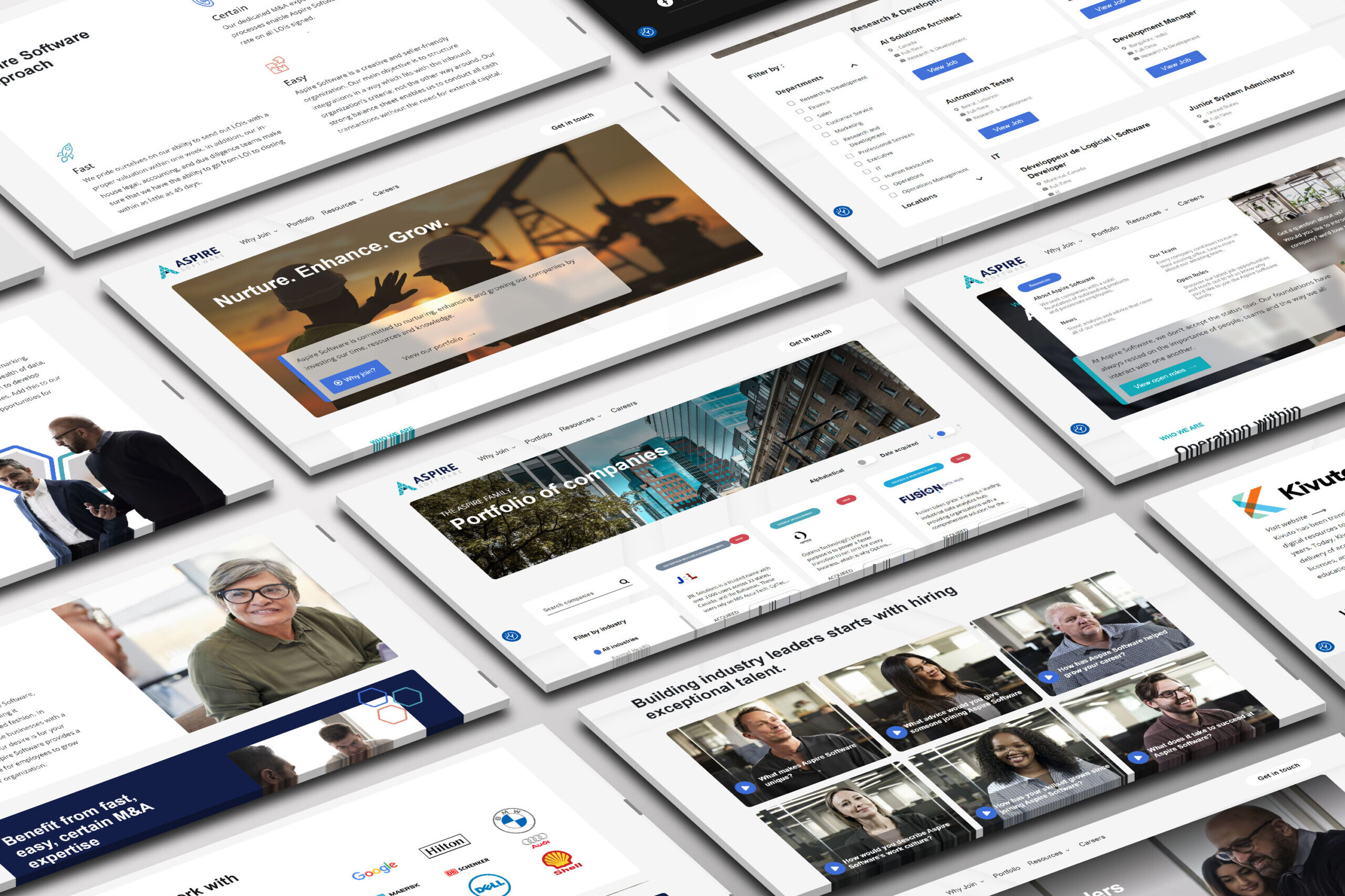 Designing the new website for Aspire Software, a subsidiary of Valsoft Corporation, was a strategic endeavor. As the operational arm for all software companies within the portfolio, it was imperative to showcase their focus on employees and technology. As the creative director, I opted for custom video content and photography to capture the essence of their 3-floor office, ensuring the site’s uniqueness.