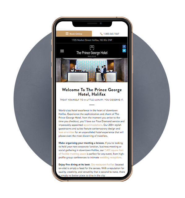 The Prince George Hotel is a beautiful hotel in Halifax that required a new website to reflect their luxury accommodations and style. We created an attractive hero section using beautiful photography of the location as well as an original and user friendly booking widget to attract users to click and reserve.